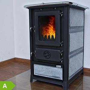- Kaminofen mit Backfach – geeignetes Brennmaterial: Scheitholz, Braunkohlebriketts
