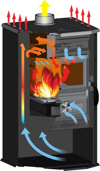 Der Leopold erwärmt den Raum sowohl durch direkte Strahlungswärme als auch durch einen Warmluftstrom. Unten im Ofen wird Luft in die Konvektionsluftschächte eingesaugt. Die Luft strömt an der heißen Verkleidung des Feuerraums sowie an diversen Wärmeableitblechen vorbei und wird erhitzt. Der warme Luftstrom steigt empor und strömt oben aus den Schlitzen heraus in den Wohnraum.
