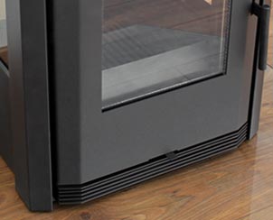 • Der Holzofen verfügt über ein ausgeklügeltes Luftströmungssystem, das eine kontinuierliche Verbrennung erlaubt und die Scheibe weitestgehend rußfrei hält. An dem unteren Drehregler kann die Primärluft eingestellt werden. (Ideal beim Anheizen!)