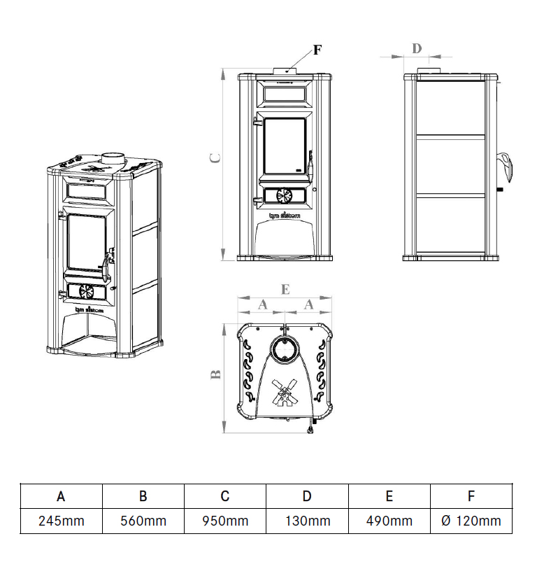 - Größe des Feuerraums: 37 cm hoch x 30 cm breit x 37 cm tief
