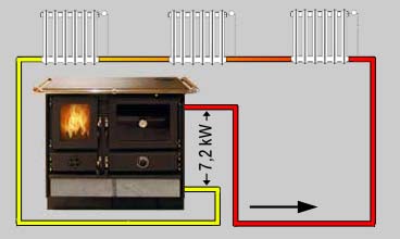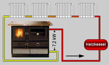 • Die an Wasser bzw. Luft abgegebene Wärme hängt stark von den Bedinungen vor Ort ab: Temperatur-Differenz Vorlauf-Rücklauf, verfeuerte Brennstoffmenge pro Stunde, Einstellung des Zugreglers (langer Abgasweg um die Backröhre = mehr Wärmeabgabe in den Raum, oder kurzer Abgasweg = weniger Wärmeabgabe in den Raum, etc.)