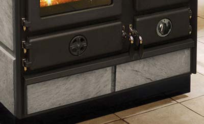 • Verkleidung aus italienischem Speckstein. Die Specksteinplatten sehen schick aus und speichern Wärme.